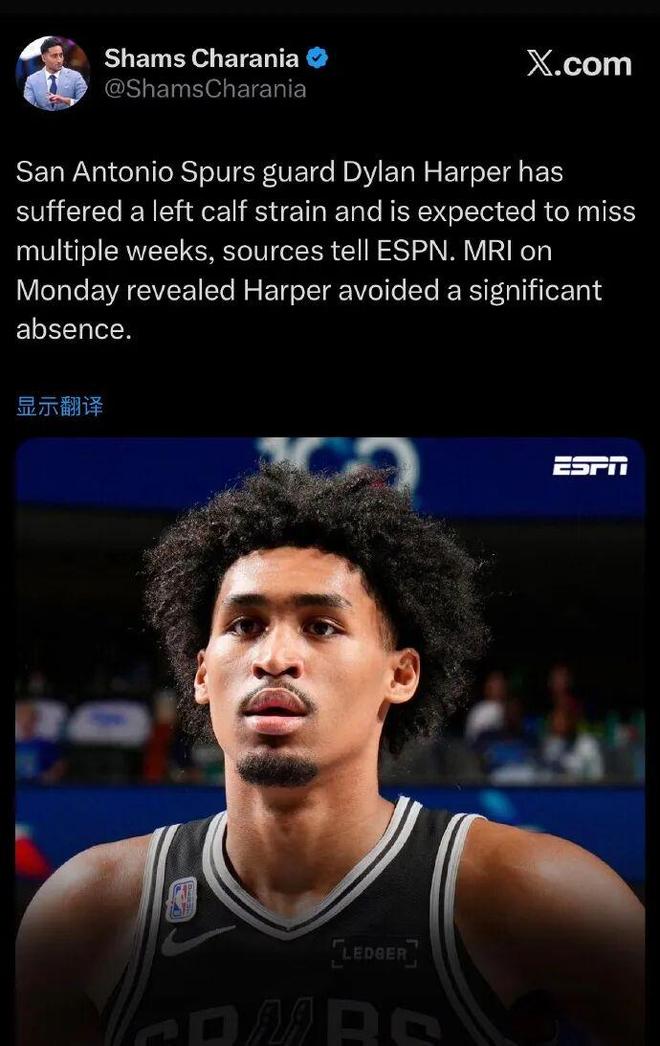 今年頗受矚目的馬刺榜眼哈珀,新秀賽季剛打了幾場好球, 遭遇左小腿拉傷,預(yù)計將缺席數(shù)周。